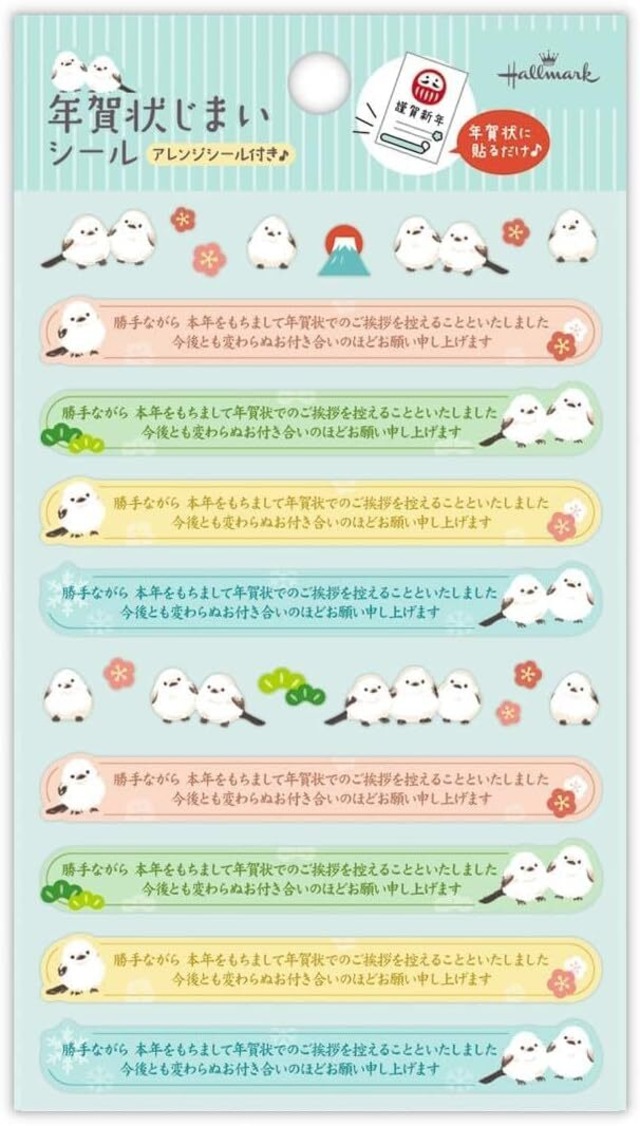 ◆シマエナガの年賀状じまい用シール◆ 次の年からの年賀状のやりとりを辞退する際に、貼るだけで手軽にお知らせできる便利なシールです。 どんなデザインのハガキにも貼りやすい横長タイプで、縦デザインの年賀状にもぴったりのサイズ感。 ハガキを可愛く飾れるアレンジシール付き!