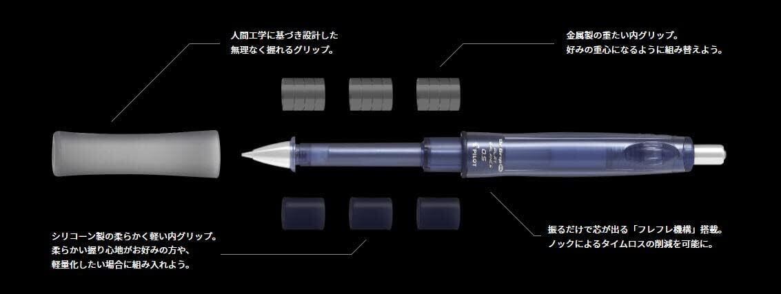 『ドクターグリップCL プレイバランス』は、付属する重量と素材の異なる2種類の内グリップを組み合わせ、組み替えることで、自分の好みの重さと重心バランスにカスタマイズ可能なシャープペンシルです。