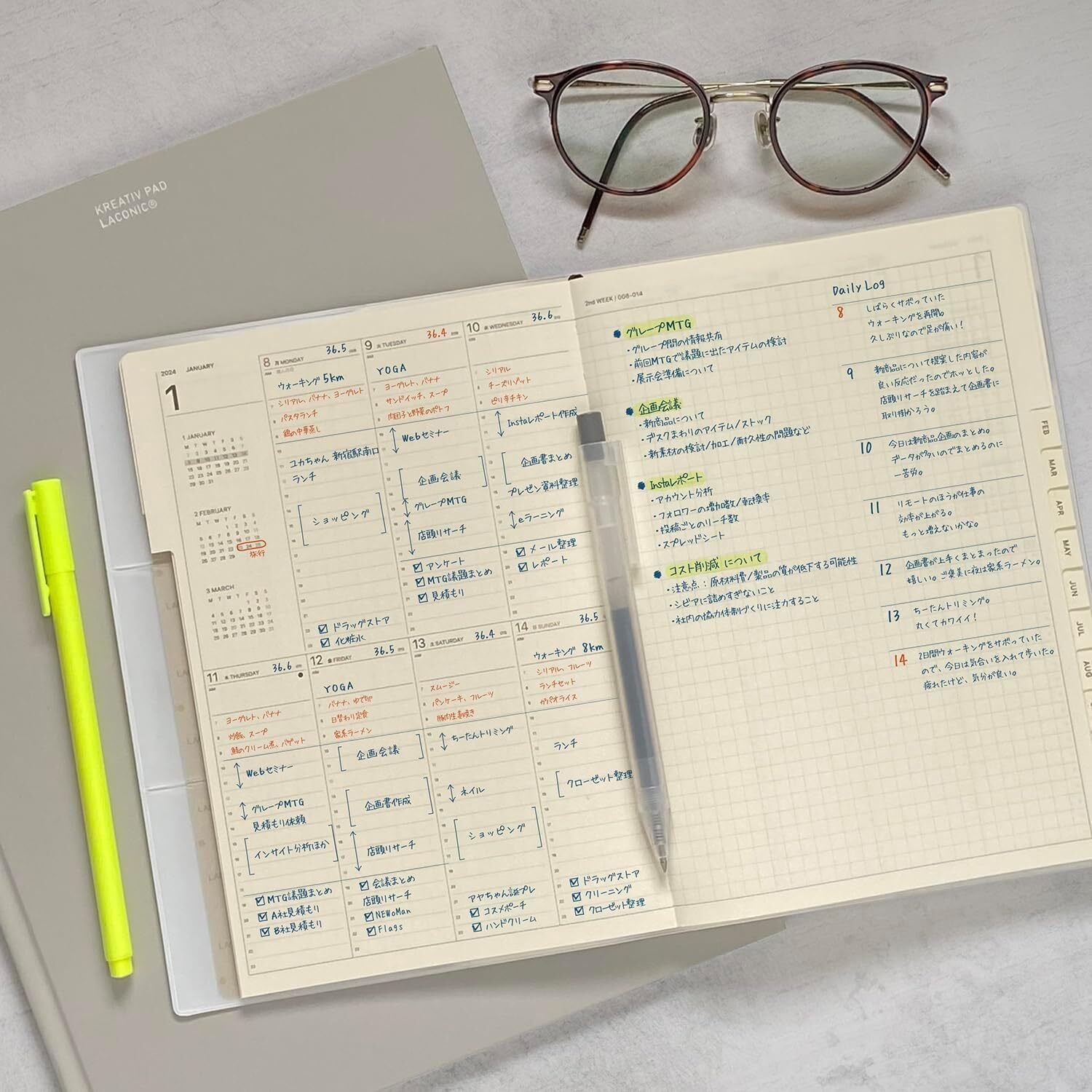 【スケジュール欄】月間:見開き1ヶ月ブロック 週間:インデックス付き片面1週間バーチカル+片面メモ(方眼)