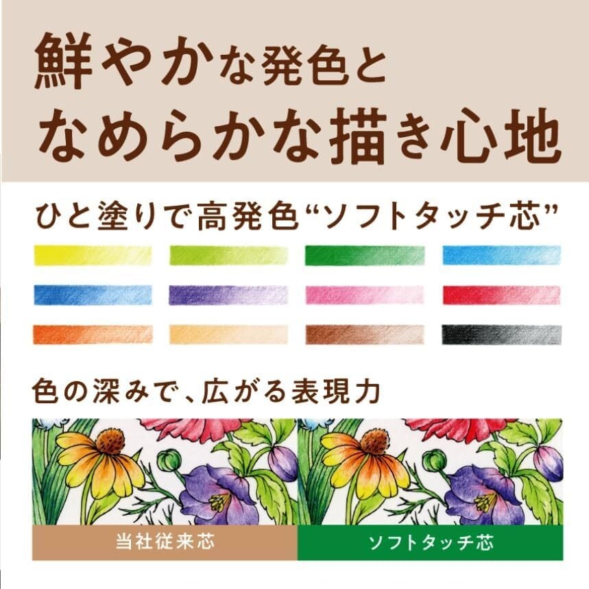 【特徴(1)】高発色ソフトタッチ芯を採用。なめらかに塗れて鮮やかな発色の色鉛筆です。筆圧の安定しない 小学生 や色鉛筆をはじめる人にもおすすめ。濃くも淡くも自在に塗れて、表現の幅が広がります。