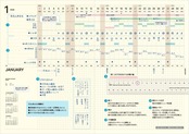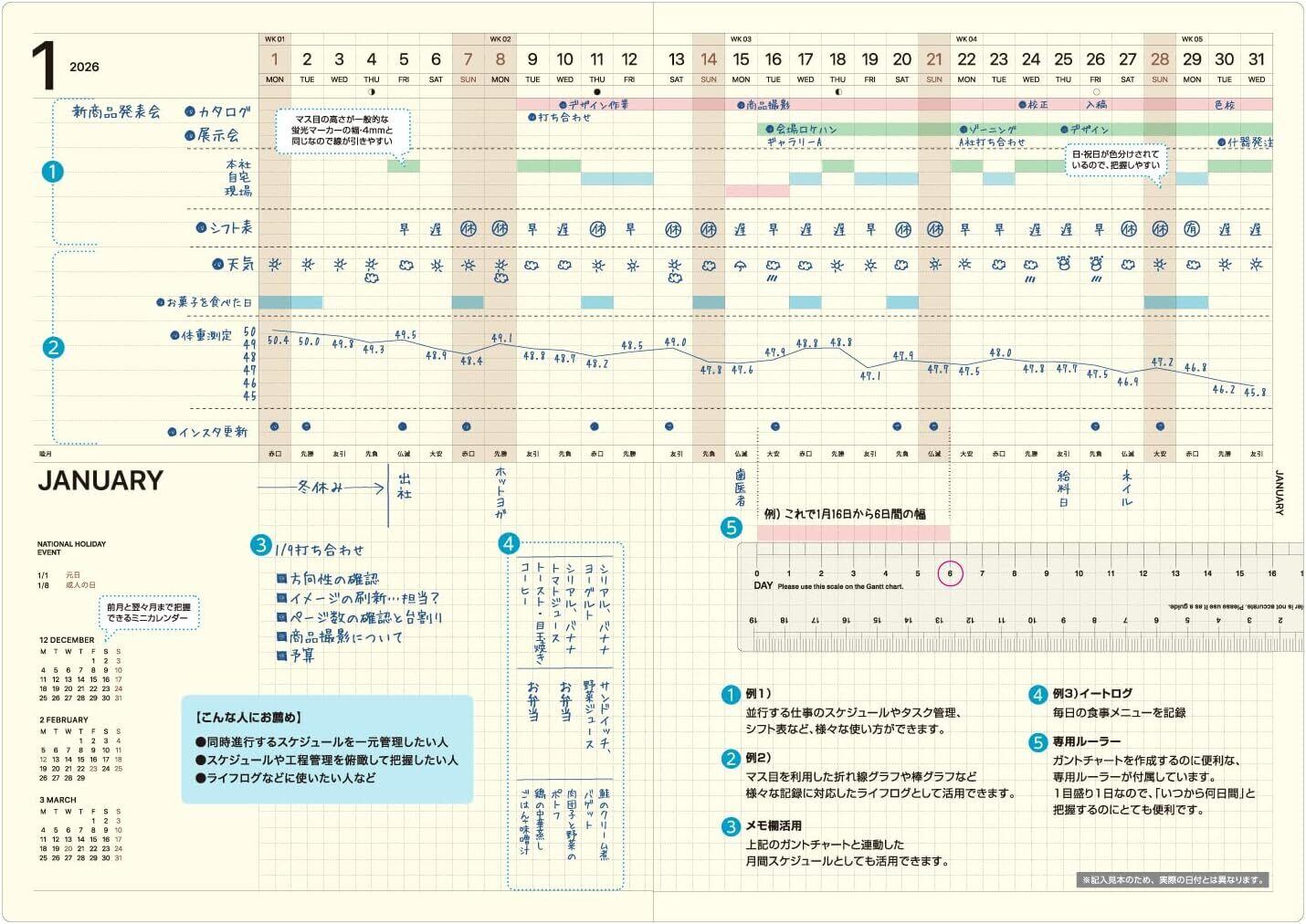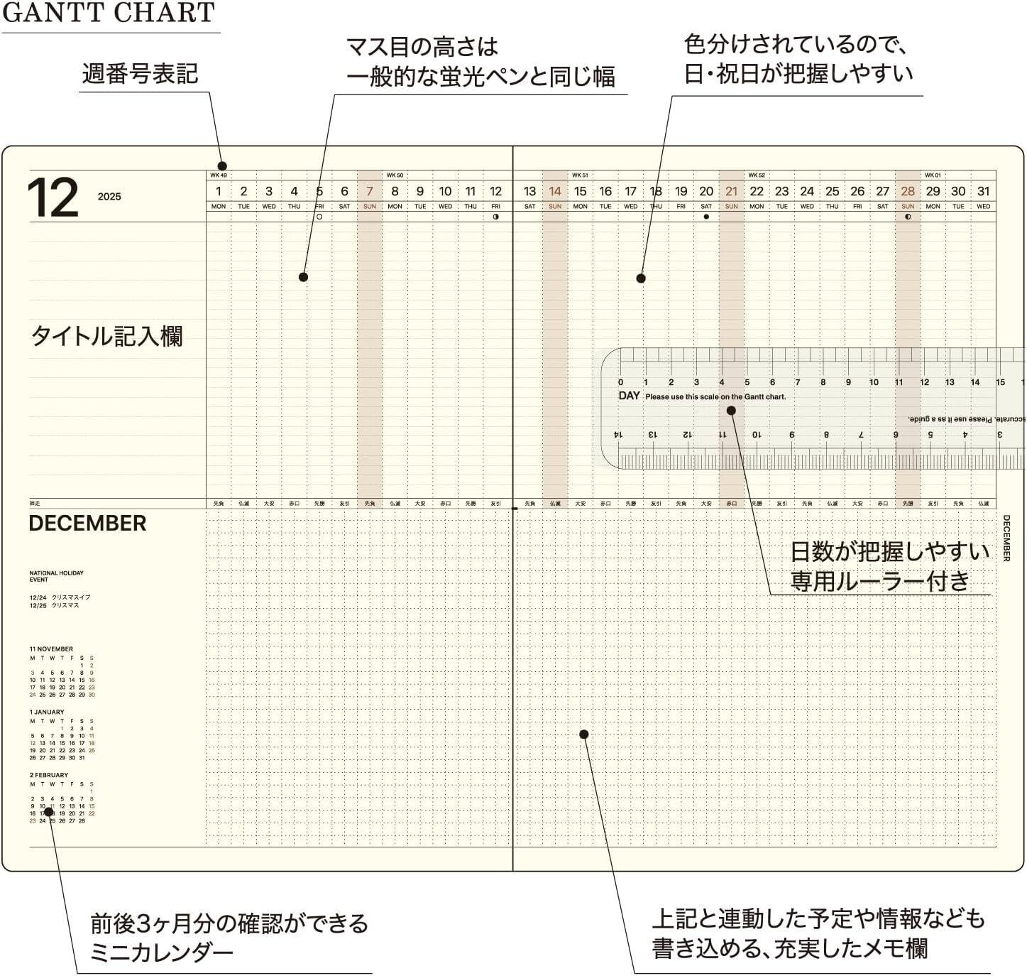 ガントチャートで1ヶ月の詳細なスケジュールの管理ができ、もっと俯瞰した時間軸の把握をしたい場合を想定した見開き4ヶ月のブロックマンスリーを巻頭に掲載しています。