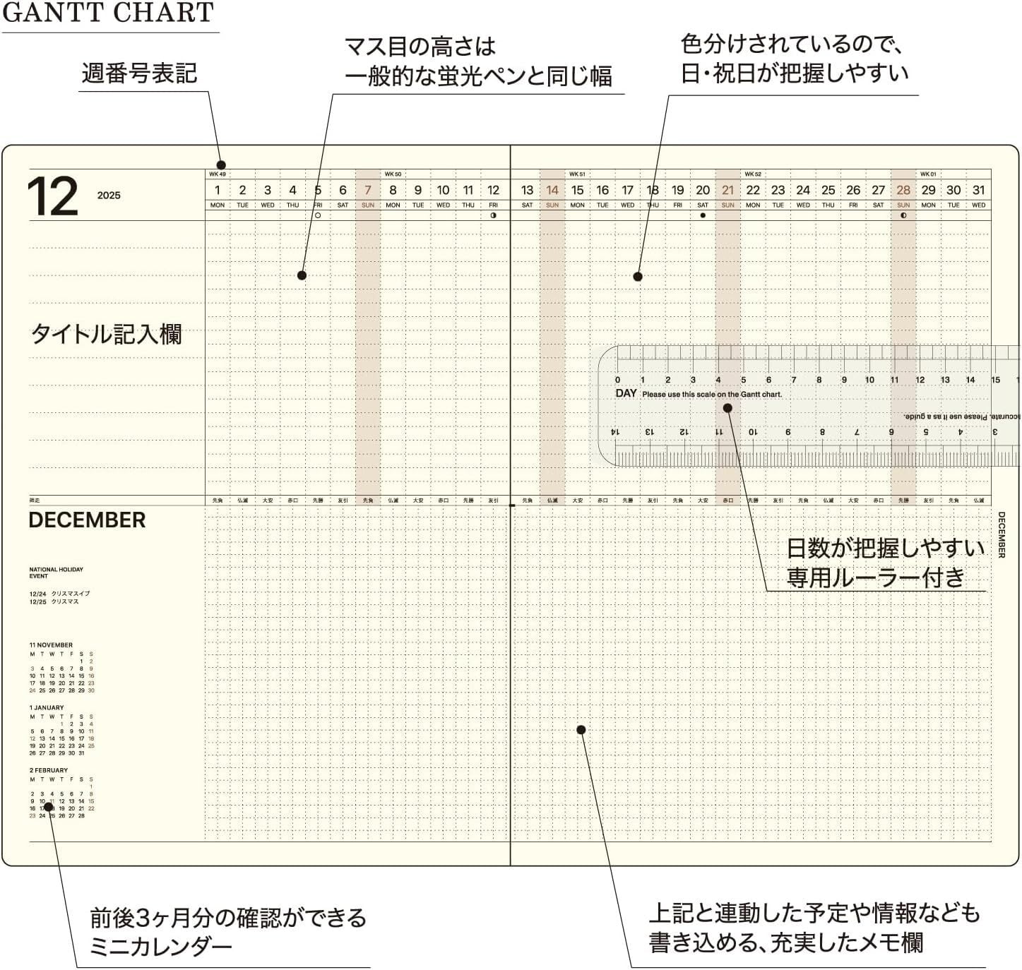 【ガントチャートマンスリータイプ】見開き1ヶ月のガントチャート形式マンスリー。ガントチャートで1ヶ月の詳細なスケジュールの管理ができ、もっと俯瞰した時間軸の把握をしたい場合を想定した見開き4ヶ月のブロックマンスリーを巻頭に掲載しています。メインのガントチャートはページ下半分をグリッドスペースに割き、図形やグラフ、アイデア、メモを自由に書き込めるよう設計しています。