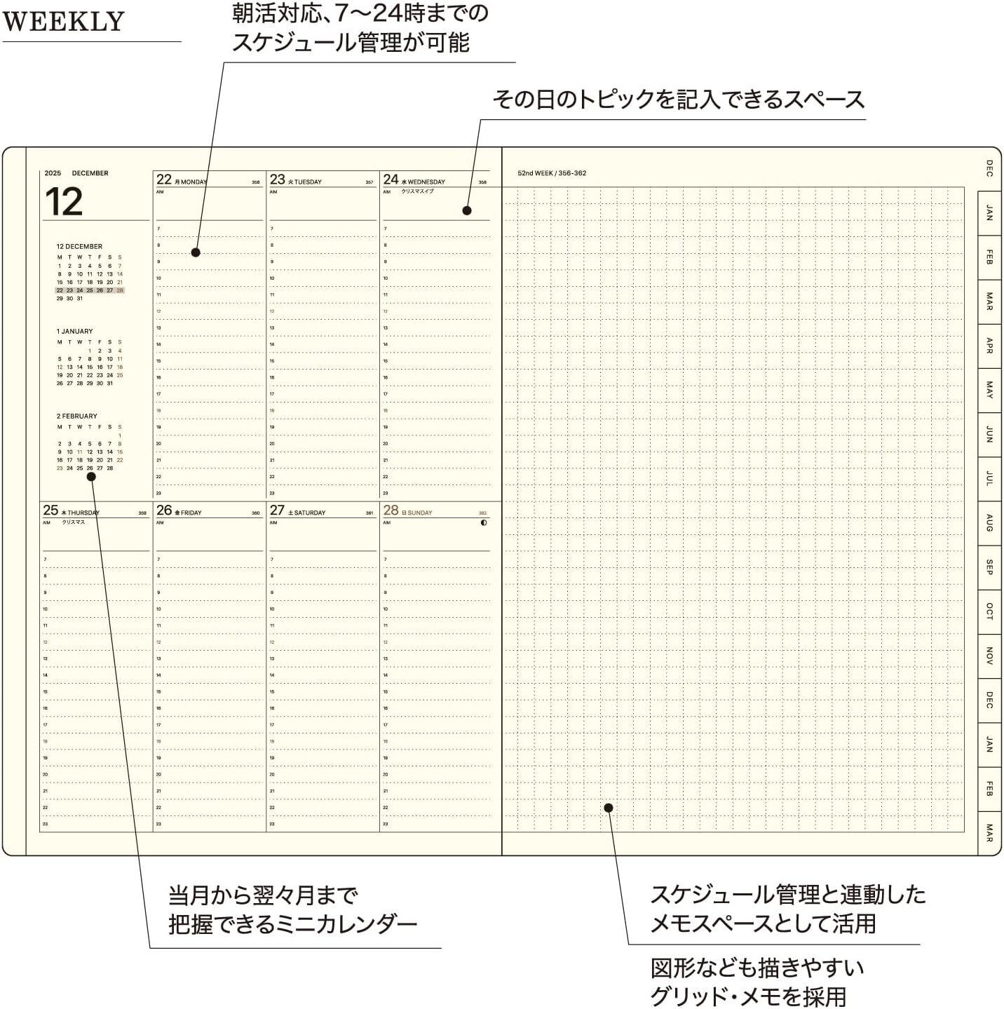 【バーチカルレフトタイプ】時間管理+充実したメモ欄の画期的な週間ダイアリー。左ページが1週間バーチカル(月曜始まり・土日均等割り)、右ページは図形も描ける自由度の高い5ミリ方眼メモ。時間枠は朝活対応の7:00〜24:00の掲載。インデックスが付いているため月毎のスケジュール&メモ管理がしやすい設計になっています。