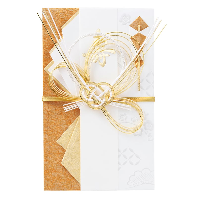 七宝柄と松竹梅の立体的なパール箔押しが上品に輝く中判サイズの金封です。