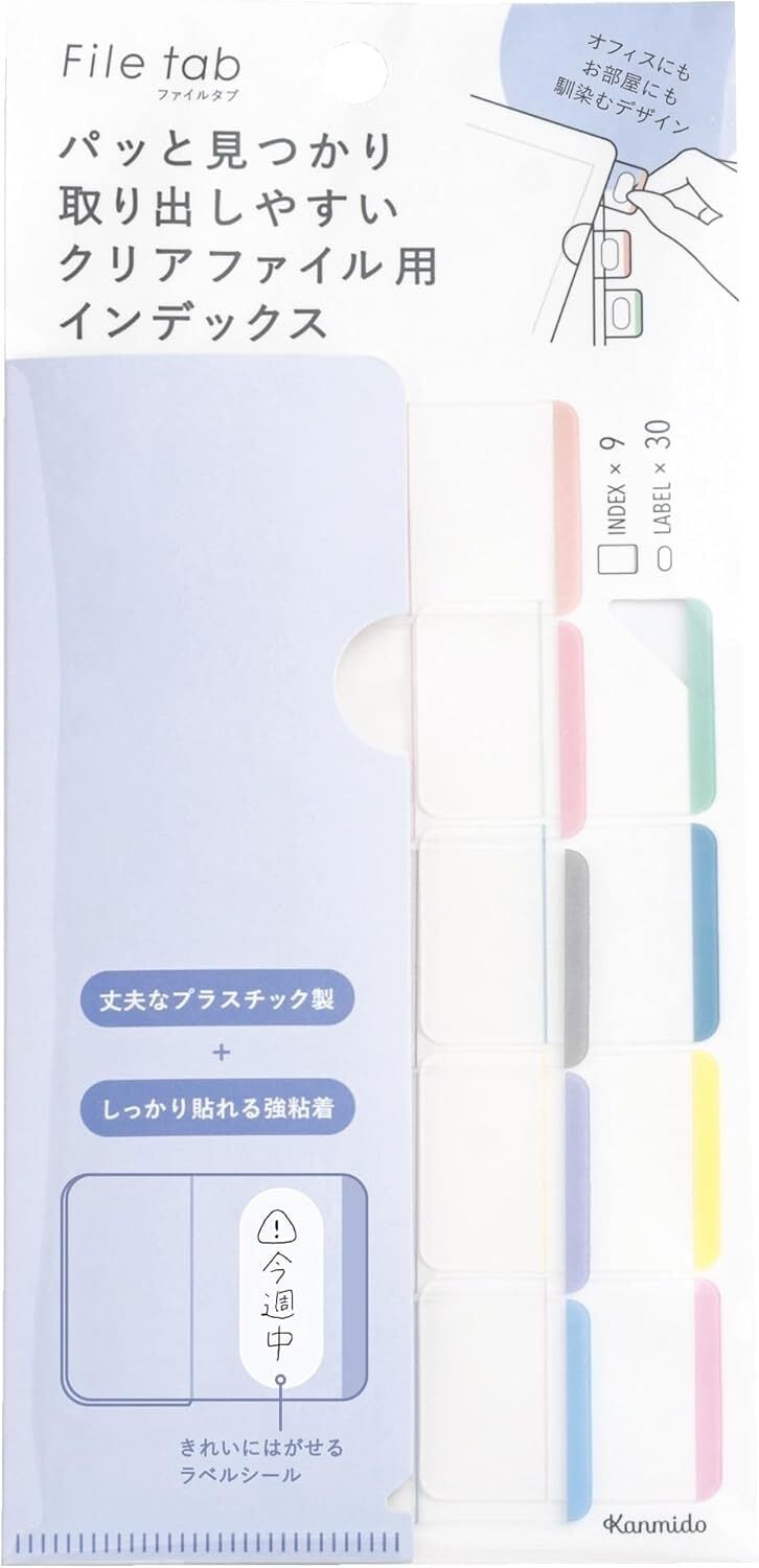 『ファイルタブ』は、しっかりとした厚みと粘着力を持つ、プラスチック製のクリアファイル用インデックスです。