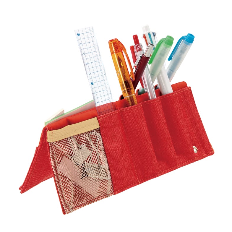 メッシュポケットは小物を入れても見つけやすく、ペンスタンドには差しにくい修正テープなども収納できます。薄型ポケットは定規などの薄いものが入れられます。