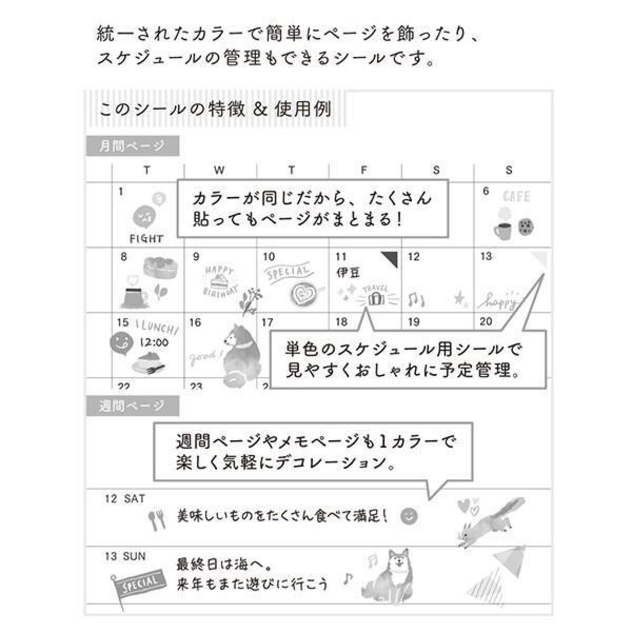 手帳の余白や日付を楽しく飾る、貼ってはがせるシールです。